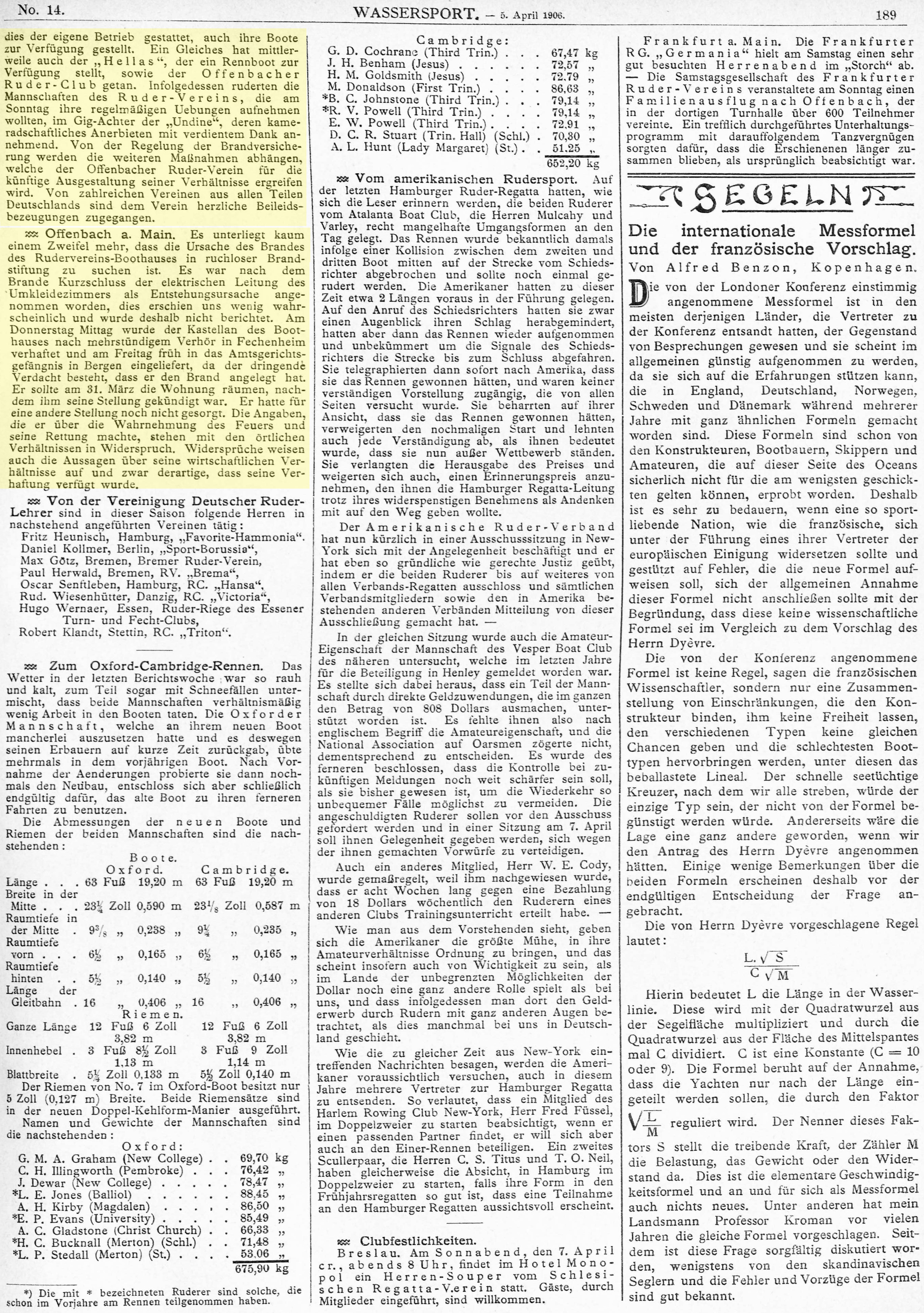 Die Offenbacher RG. „Undine“ hat dem Offenbacher Ruder-Verein noch am Tage des Brandes seines Bootshauses ihre herzlichste Teilnahme ausgesprochen und ihm ihr Bootshaus, sowie, soweit dies der eigene Betrieb gestattet, auch ihre Boote zur Verfügung gestellt. Ein Gleiches hat mittlerweile auch der „Hellas“, der ein Rennboot zur Verfügung stellt, sowie der Offenbacher Ruder-Club getan. Infolgedessen ruderten die Mannschaften des Ruder-Vereins, die am Sonntag ihre regelmäßige Uebungen aufnehmen wollten, im Gig-Achter der „Undine“, deren kameradschaftliches Anerbieten mit verdientem Dank annehmend. Von der Regelung der Brandversicherung werden die weiteren Maßnahmen abhängen, welche der Offenbacher Ruder-Verein für die künftige Ausgestaltung seiner Verhältnisse ergreifen wird. Von zahlreichen Vereinen aus allen Teilen Deutschlands sind dem Verein herzliche Beileidsbeuzgungen zugegangen.