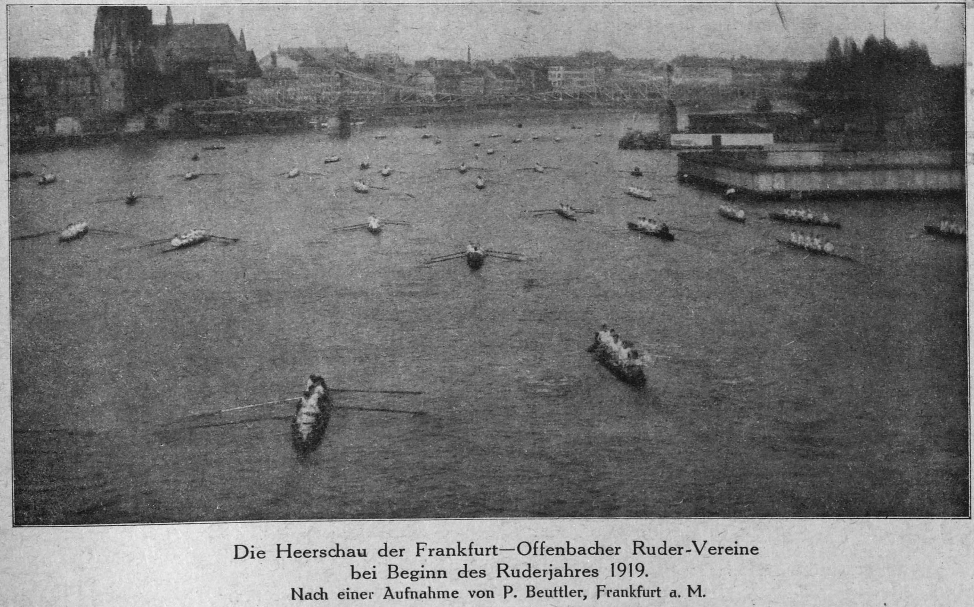 Ein herrlicher Maientag! Nach vielen kalten Regentagen endlich über Nacht ein unerwarteter Wetterwechsel. Die Ruderer hatten ihn längst herbeigesehnt, sie waren gerüstet auf den Beginn der Ruderzeit, die mir einer machtvollen Kundgebung den Frankfurter Ruderfreunden vor Augen geführt werden sollte. In aller Stille waren die Vorbereitungen getroffen worden und der Erfolg war nach Erwarten ausgefallen. Vielleicht hätte die Beteiligung noch stärker sein können, wenn die ganz Vorsichtigen sich eher mit einem möglichen Wetterumschlag vertraut gemacht hätten, aber es war auch gut so. Es fehlte nur noch die Mobilisierung der Zuschauer, aber die war gleich vollzogen. Ein deutlicher Wink in der gesamten Presse von Frankfurt und Offenbach und alles war pünktlich zur Stelle. Noch am Vorabend kam ein Fernspruch von Offenbach: Fahrn mer? Ja, mer fahrn! Gut, mer komme mit siwe Boote!