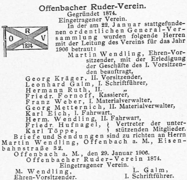 Offenbach: Der Offenbacher Ruderverein 1874 hielt am Montag, den 22. Januar seine diesjährige ordentliche Generalversammlung ab, die sich eines guten Besuchs erfreute.