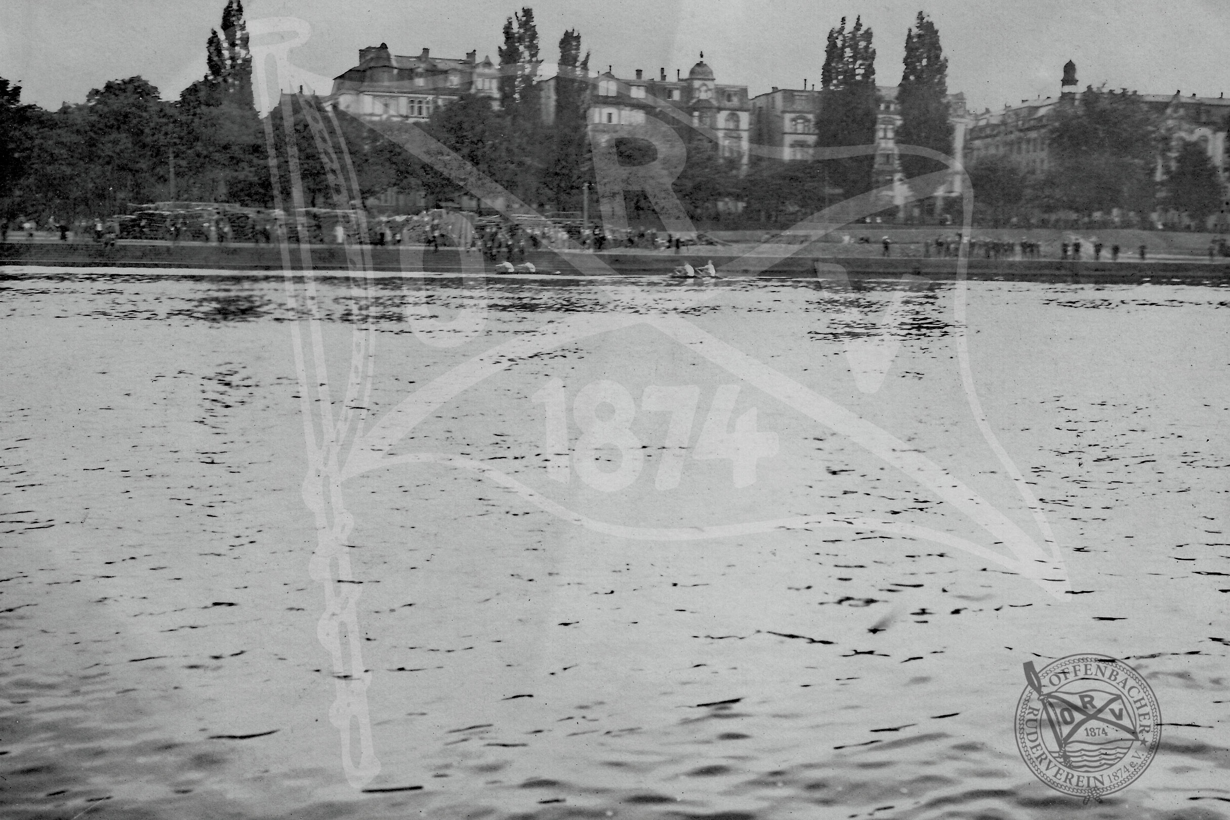 Durch das zurücktreten des Mannheimer und Wormser Achters schien das Rennen an Interesse verlieren. Dies war jedoch nicht der Fall, da die drei gestartetem Mannschaften sich bis ins Ziel einen beispiellosen Kampf lieferten. Auf der Mitte der Strecke hatte noch keine Mannschaft einen merklichen Vorteil errungen. Auf der zweiten Hälfte konnten Mainz sowohl wie Offenbach etwas gutmachen. Frankfurt verlor etwa eine halbe Länge. Mainz ging dann eine halbe Länge in Führung, während Frankfurt gegen Offenbach eine Kleinigkeit aufholte. Der Endkampf war gewaltig. Je eine halbe Länge trennte die Boote im Ziel.